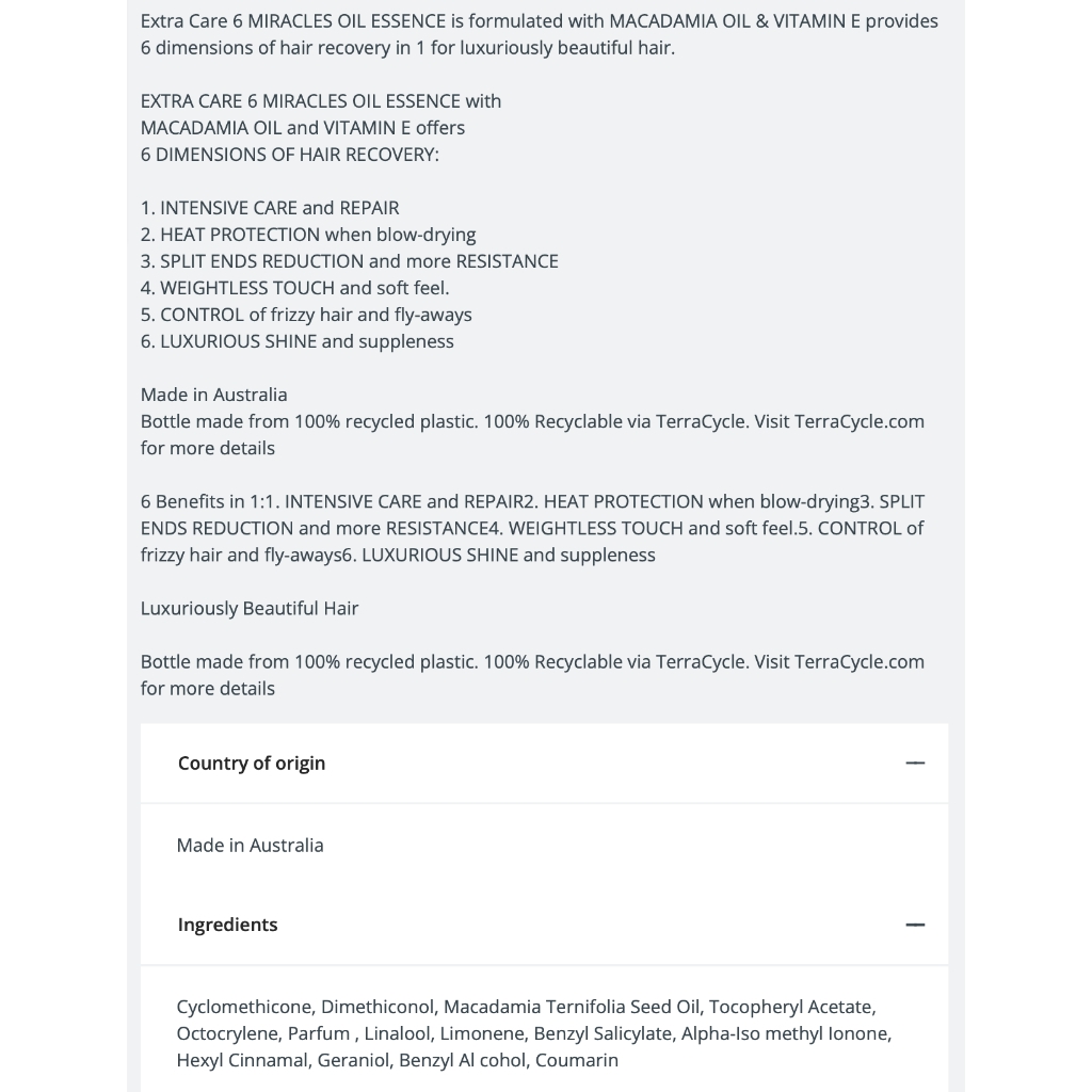 MIX 6 TINH DẦU DƯỠNG TÓC Schwarzkopf Extra Care 6 Miracles Oil Essence – Phục Hồi Tóc Hư Tổn, Bóng Mượt, Chống Xù Rối, 100mlSchwarzkopf là thương hiệu chăm sóc tóc danh tiếng đến từ Đức với hơn 120 năm phát triển, trực thuộc tập đoàn Henkel. Schwarzkopf luôn chú trọng đổi mới, mang đến giải pháp toàn diện giúp mái tóc khỏe, bóng mượt và chuẩn salon ngay tại nhà, đồng thời hướng đến các giá trị bền vững và thân thiện môi trường.1. Schwarzkopf Extra Care 6 Miracles Oil Essence là tinh dầu dưỡng tóc cao cấp sản xuất tại Úc, kết hợp Macadamia Oil & Vitamin E, giúp phục hồi tóc toàn diện chỉ trong 1 sản phẩm. Công thức nhẹ, không bết dính, mang lại mái tóc mềm mượt, chắc khỏe và óng ả như salon.✨ 6 Công dụng trong 1 (6-in-1 Hair Treatment) phục hồi tóc toàn diện:1️⃣ Nuôi dưỡng & phục hồi chuyên sâu tóc hư tổn.2️⃣ Bảo vệ tóc khi sấy/nhiệt (heat protection).3️⃣ Giảm chẻ ngọn, tăng độ chắc khỏe.4️⃣ Kết cấu nhẹ, không bết dính, tóc mềm mượt tự nhiên.5️⃣ Kiểm soát xù rối, tóc con (flyaways).6️⃣ Tăng độ bóng mượt & đàn hồi cho tóc.🌿 Thành phần nổi bậtMacadamia Oil (dầu hạt mắc ca): dưỡng ẩm sâu, phục hồi tóc khô xơ.Vitamin E: chống oxy hóa, giúp tóc khỏe và bóng hơn.💁♀️ Trải nghiệm khi sử dụngTóc mềm mượt ngay sau khi dùng.Không gây nặng tóc, không bết dính.Hương thơm dễ chịu, sang nhẹ.Phù hợp dùng trước hoặc sau khi tạo kiểu.🌱 Bao bì thân thiện môi trường: Chai làm từ 100% nhựa tái chế, có thể tái chế 100% qua TerraCycle.📌 Phù hợp với:Tóc khô xơ, hư tổn, chẻ ngọn.Tóc uốn, nhuộm, tạo kiểu nhiều.Người cần dưỡng tóc nhanh – tiện – hiệu quả.2. Extra Care Daily Oil Elixir là tinh dầu dưỡng tóc phù hợp cho mọi loại tóc, được bổ sung Argan Oil & Vitamin Egiúp phục hồi hư tổn, tăng độ mềm mại và mang lại mái tóc bóng mượt tự nhiên.Công thức nhẹ, thẩm thấu nhanh giúp tóc không bết dính, dễ sử dụng hàng ngày để nuôi dưỡng và bảo vệ tóc.Mã sản phẩm: B054-EC-100, B054-DO-100.----- ANZ Made - Hàng chính hãng Australia & New Zealand.MỜI BẠN GHÉ THĂM THÊM GIAN HÀNG CỦA SHOP TRÊN TRANG KHÁC: www.shopee.vn/anzmade.- ANZ Made: ANZ được ghép từ chữ viết tắt của Australia và New Zealand, đồng thời mang ý nghĩa “A - Z” là thành phẩm được sản xuất từ nguyên liệu trồng tại 2 quốc gia tươi đẹp và trong lành này, Made in Australia hoặc Made in NZ. - A Passion for Wellness: Đam mê hướng tới sức khỏe của cộng đồng, ANZ Made mang đến các dòng thực phẩm, thực phẩm chức năng, hóa mỹ phẩm, chăm sóc cá nhân,… an toàn và thân thiện môi trường. - Logo thể hiện hình ảnh nước Australia và lá dương xỉ biểu tượng New Zealand.